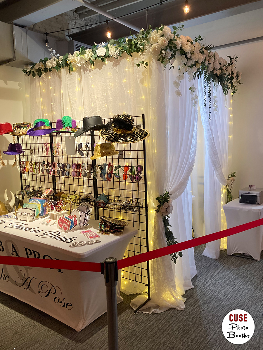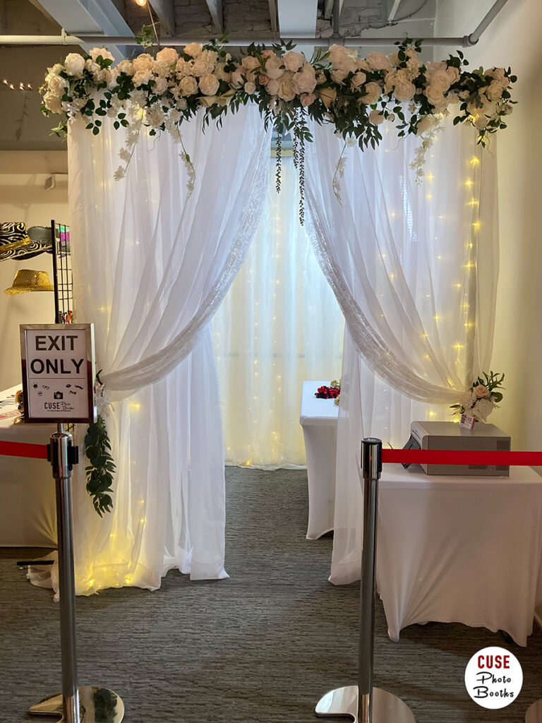 The Wedding Spectacular is elegant and ethereal with hanging lights wrapped by white sheer curtains. Floral accents adorn the entrance and top of the booth, adding to the overall romantic ambience.